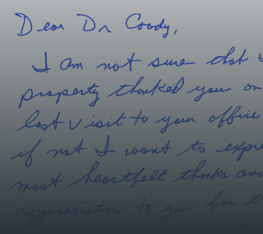 Dr. Coady, you are the best! Thank you for your attentive care—and thank your staff. I speak of you at least once a week!