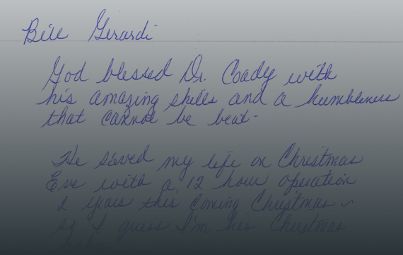 After being the first heart patient, the second day the new hospital opened, my experience with you from day one could not have been better. After my thoracic aortic aneurysm operation, I and my entire family want to thank you and say God bless you, always.