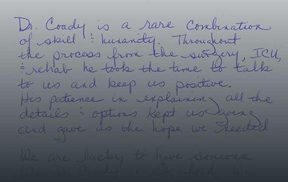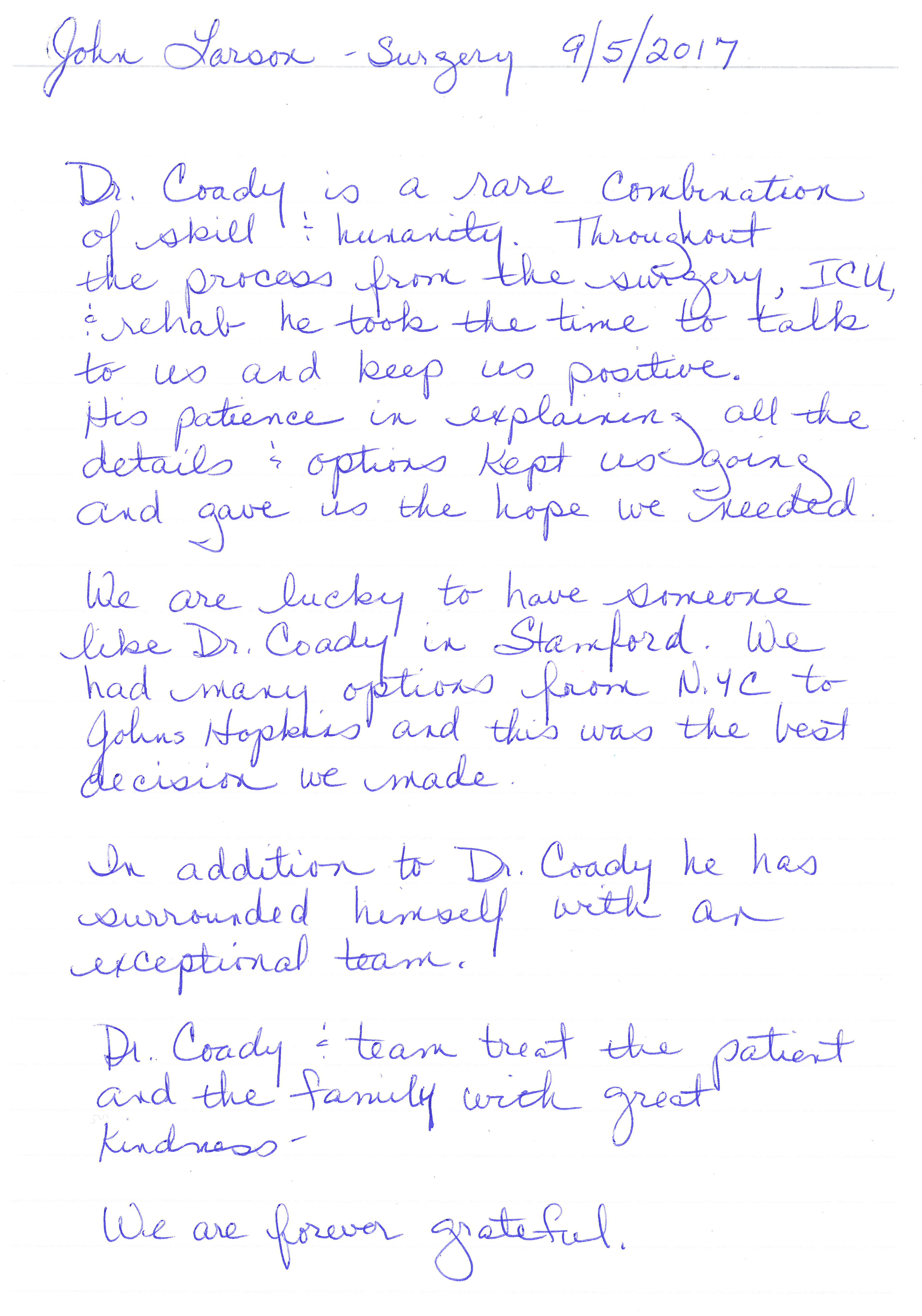 Dr. Coady is a rare combination of skill and humanity. Throughout the process from the surgery, ICU, and rehab he took the time to talk to us and keep us positive. His patience in explaining all the details and options kept us going and gave us the hope we needed.