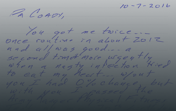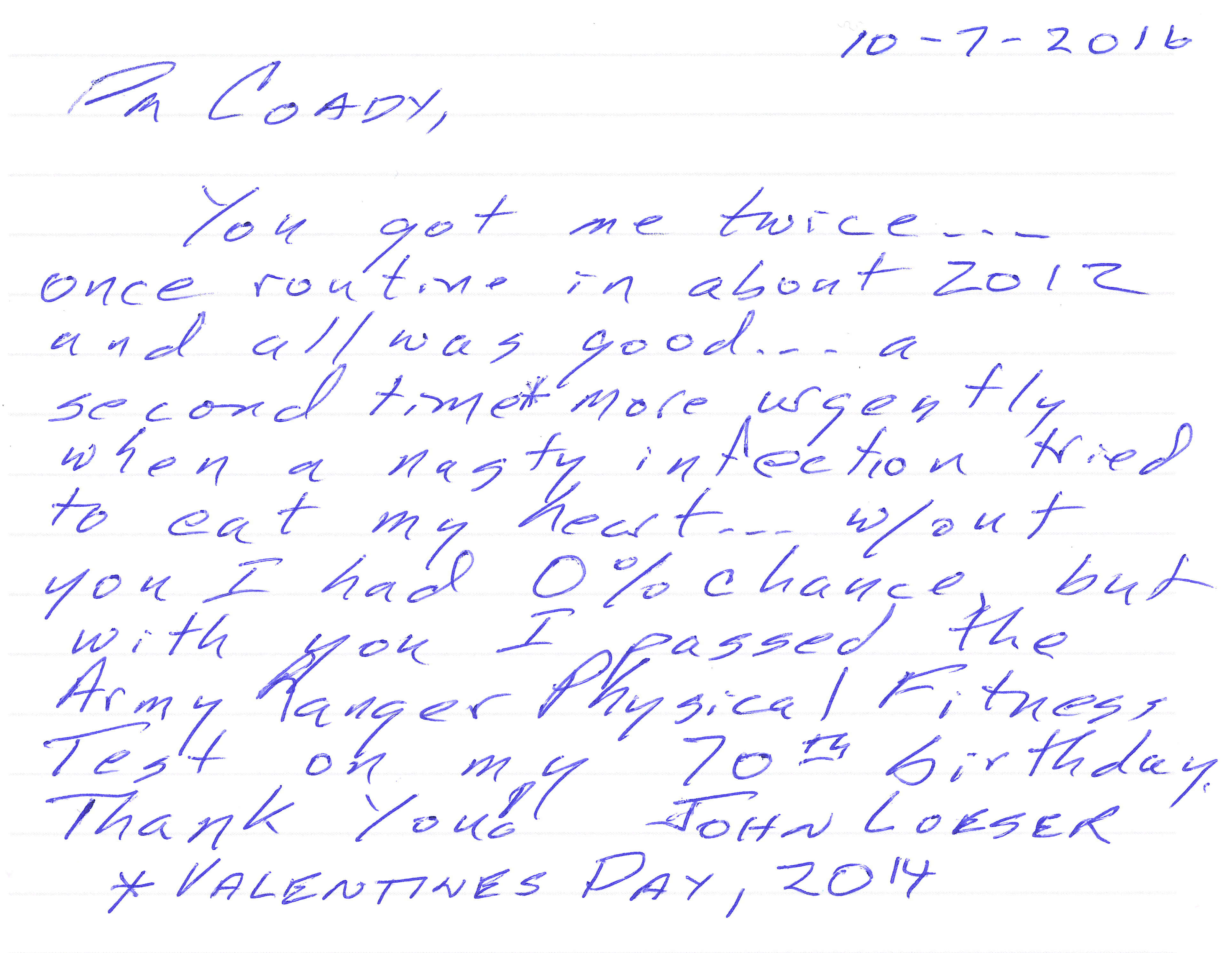 You got me twice: once routine in about 2012 and all was good. A second time (more urgently) when a nasty infection tried to eat my heart. Without you, I had 0% chance, but with you I passed the Army Ranger Physical Fitness Test on my 70th birthday. Thank you!