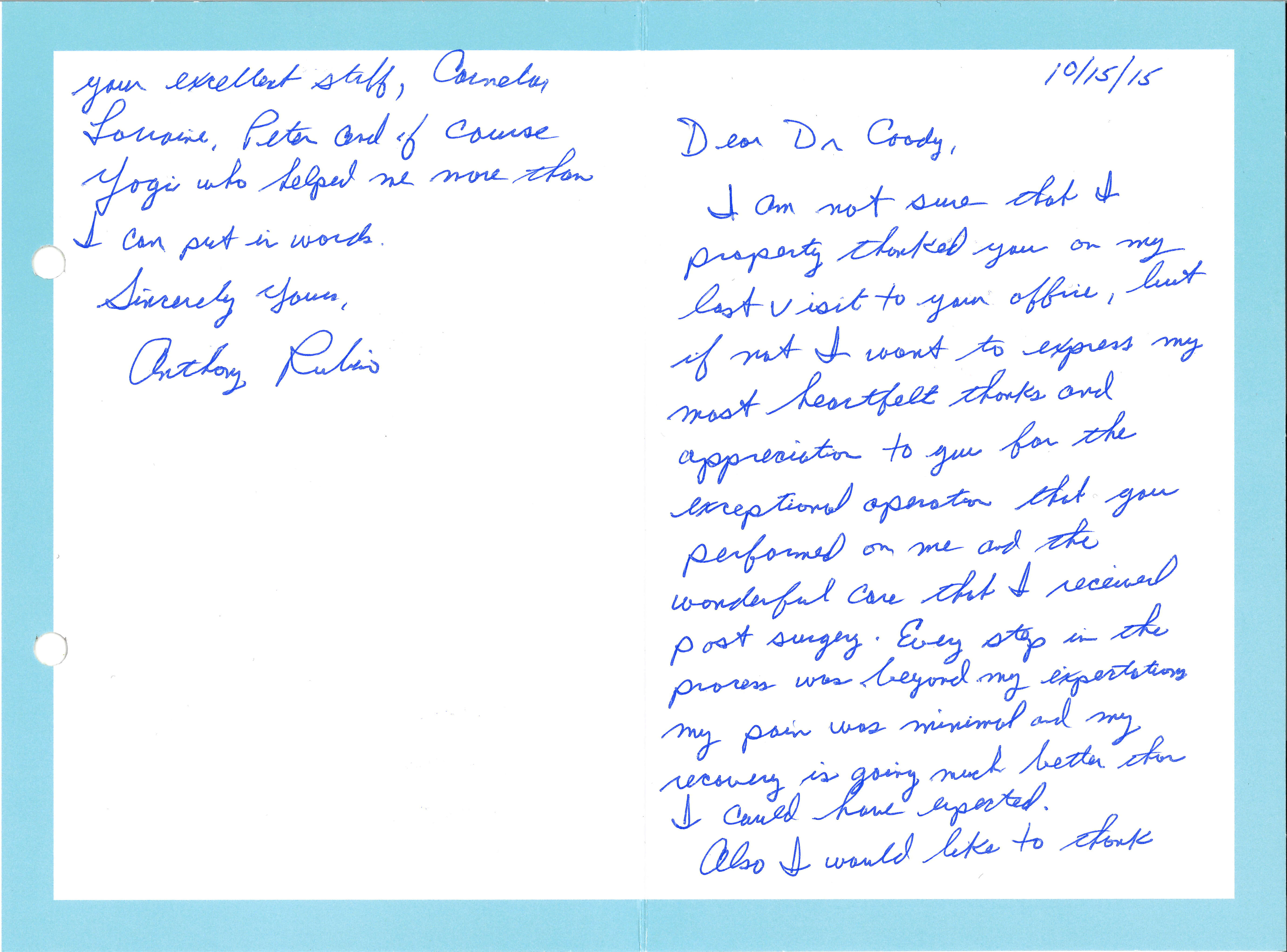 I am not sure that I properly thanked you on my last visit to your office, but if not, I want to express my most heartfelt thanks and appreciation to you for the exceptional operation that you performed on me, and the wonderful care that I received post-surgery. Every step in the process was beyond my expectations: my pain was minimal and my recovery is going much better than I could have expected.