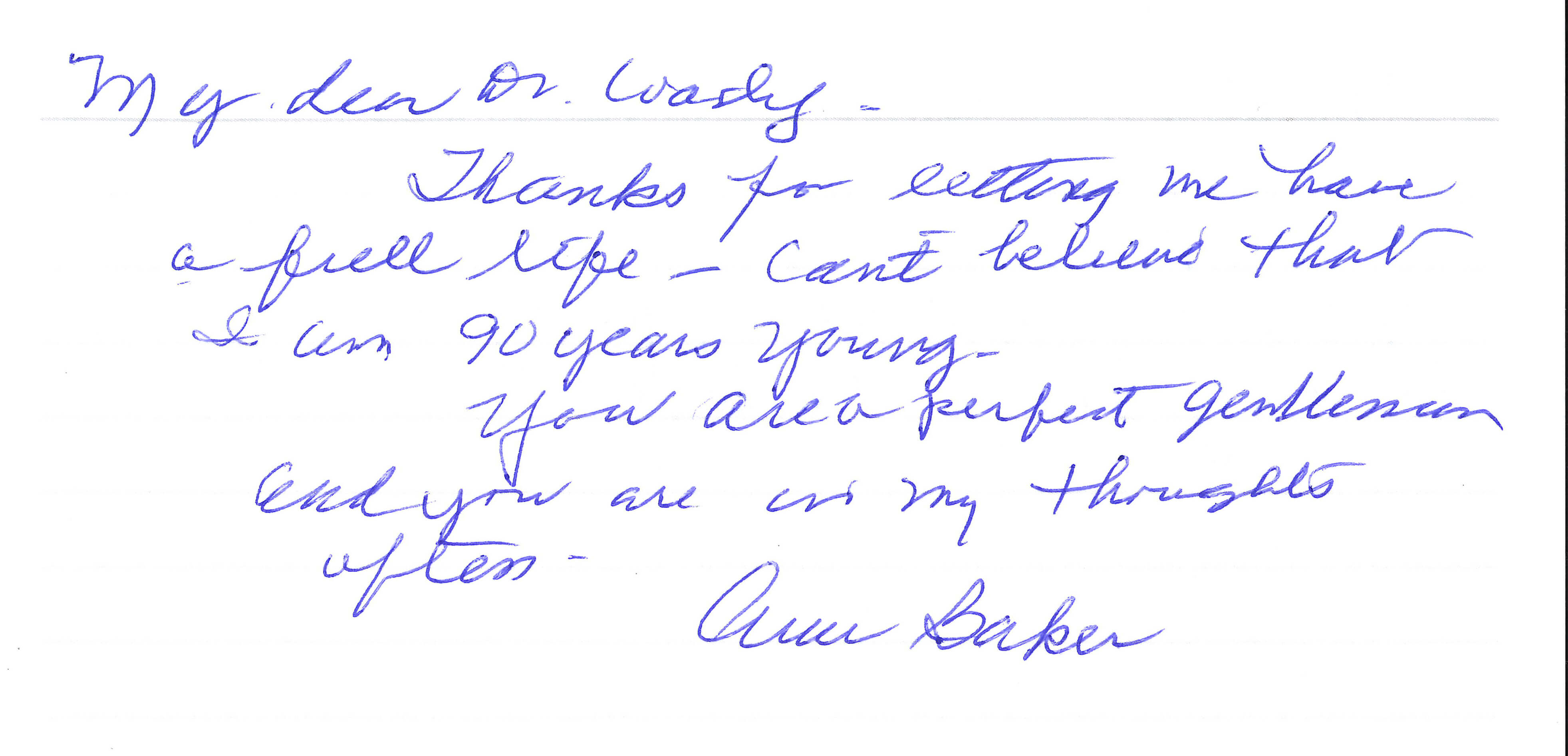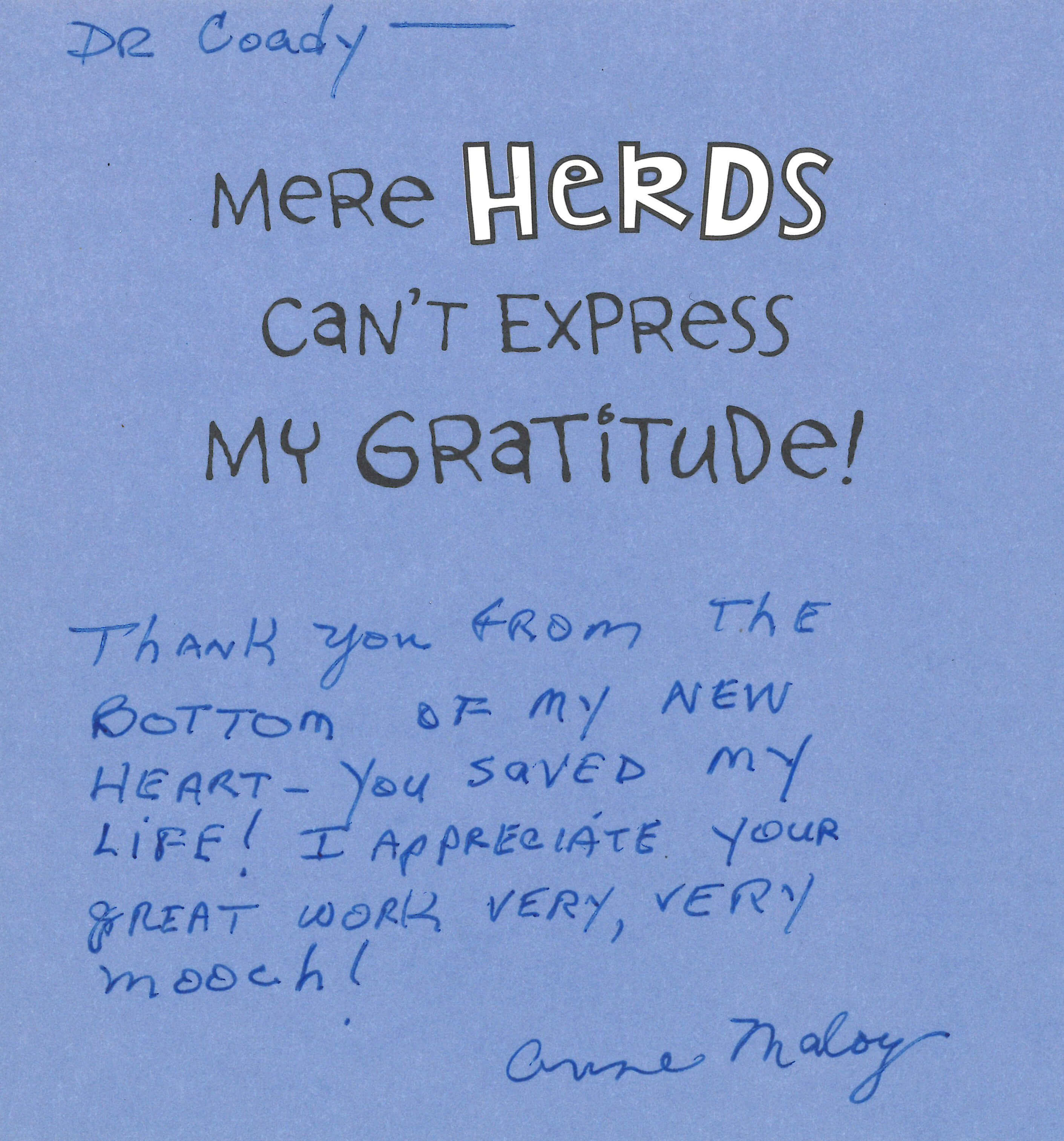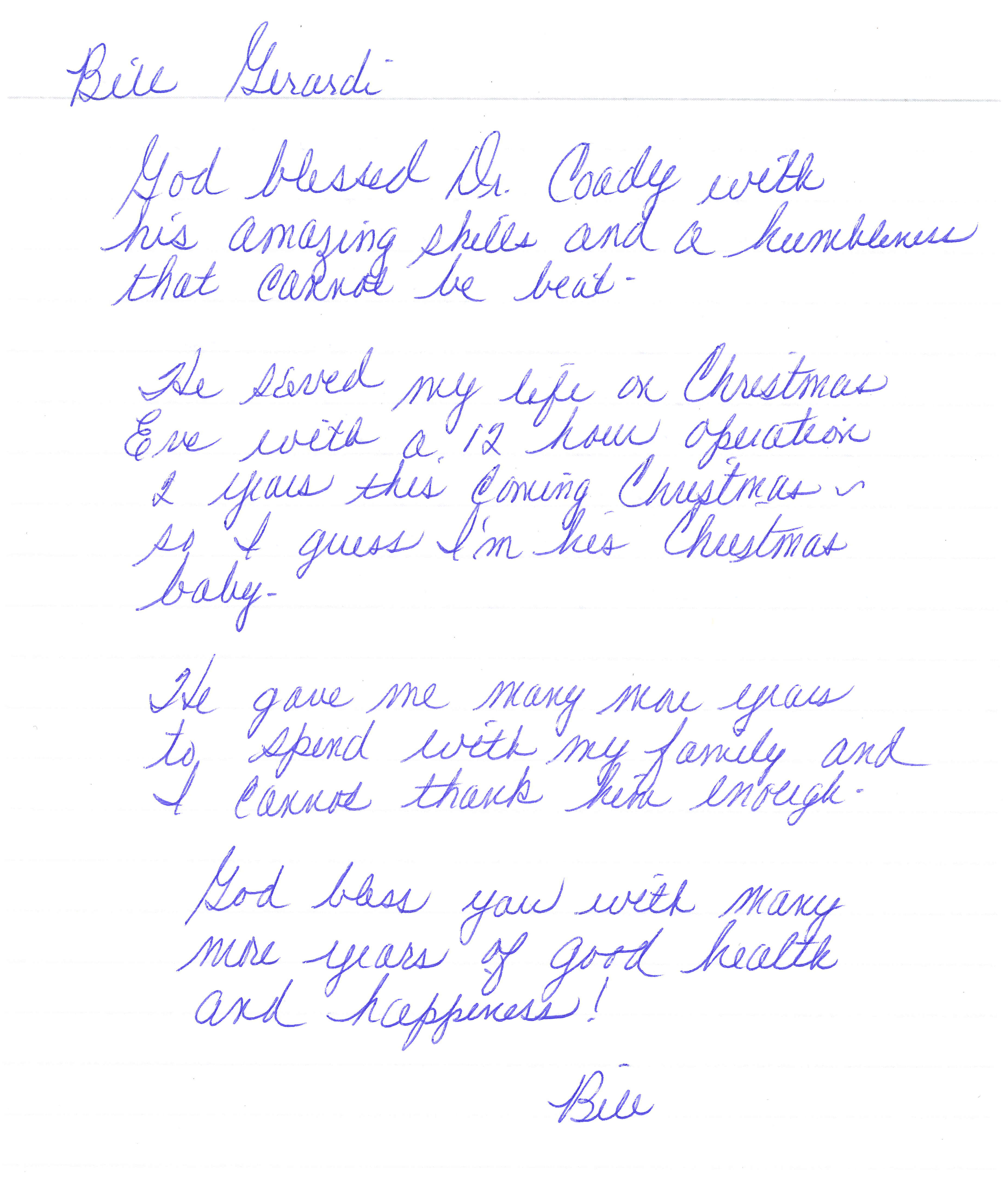 Dr. Coady, you still are terrific. Thank you and the hospital staff for the care and kindess you gave to me and my family.